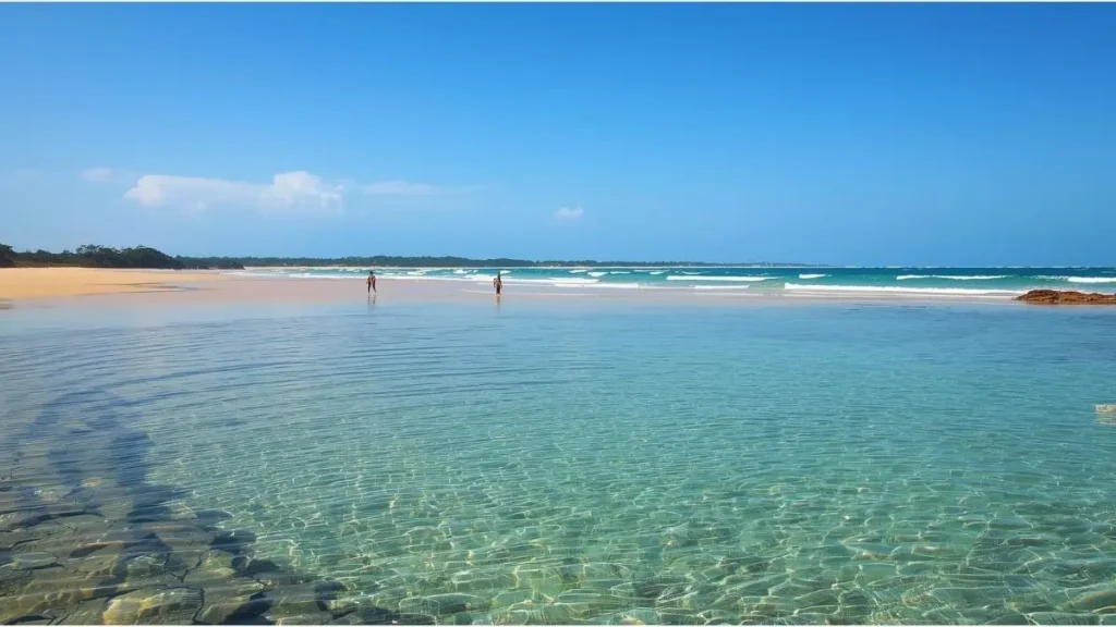 Durante a maré baixa, revelam-se tesouros aquáticos impressionantes. Duas lagoas de água doce complementam a experiência balnear.